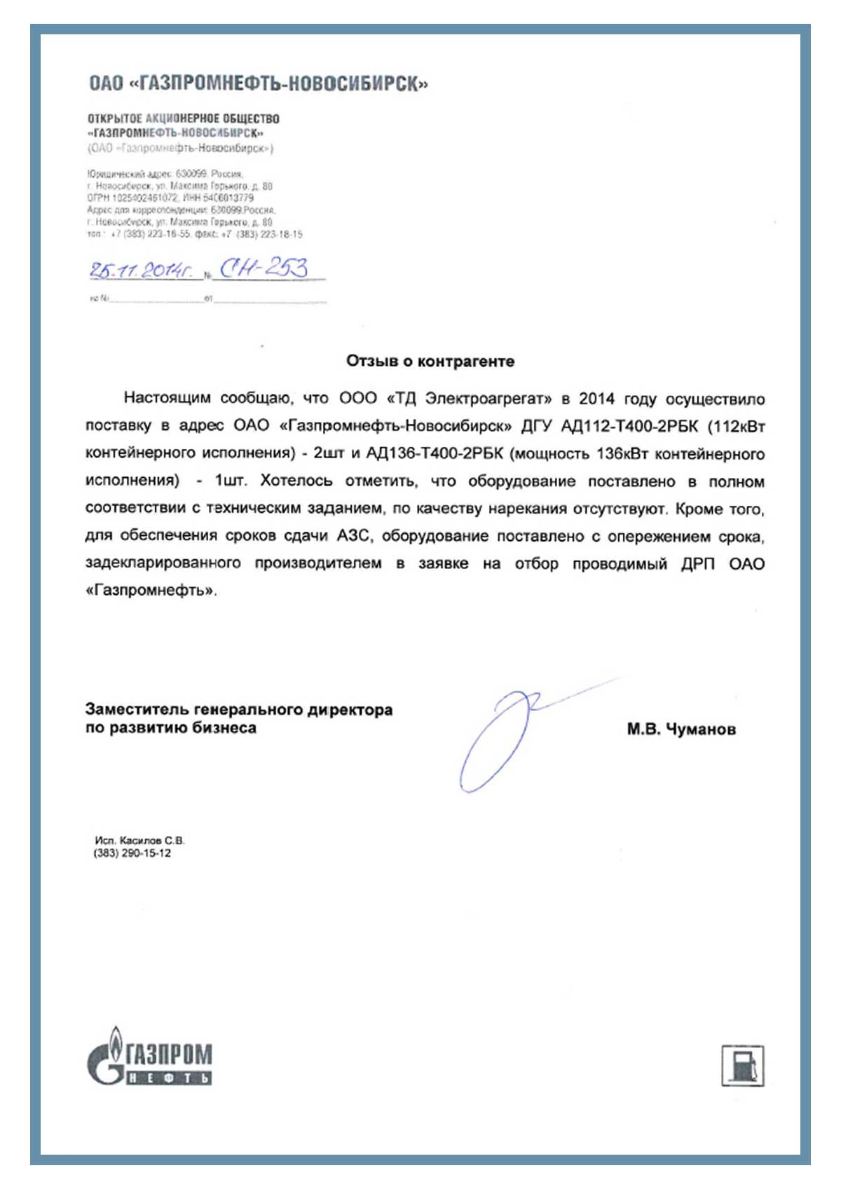 [ALT] => Отзыв контрагентов о компании ООО «ТД Электроагрегат» и исполненном проекте для ОАО «Газпромнефть - Новосибирск», г Новосибирск
