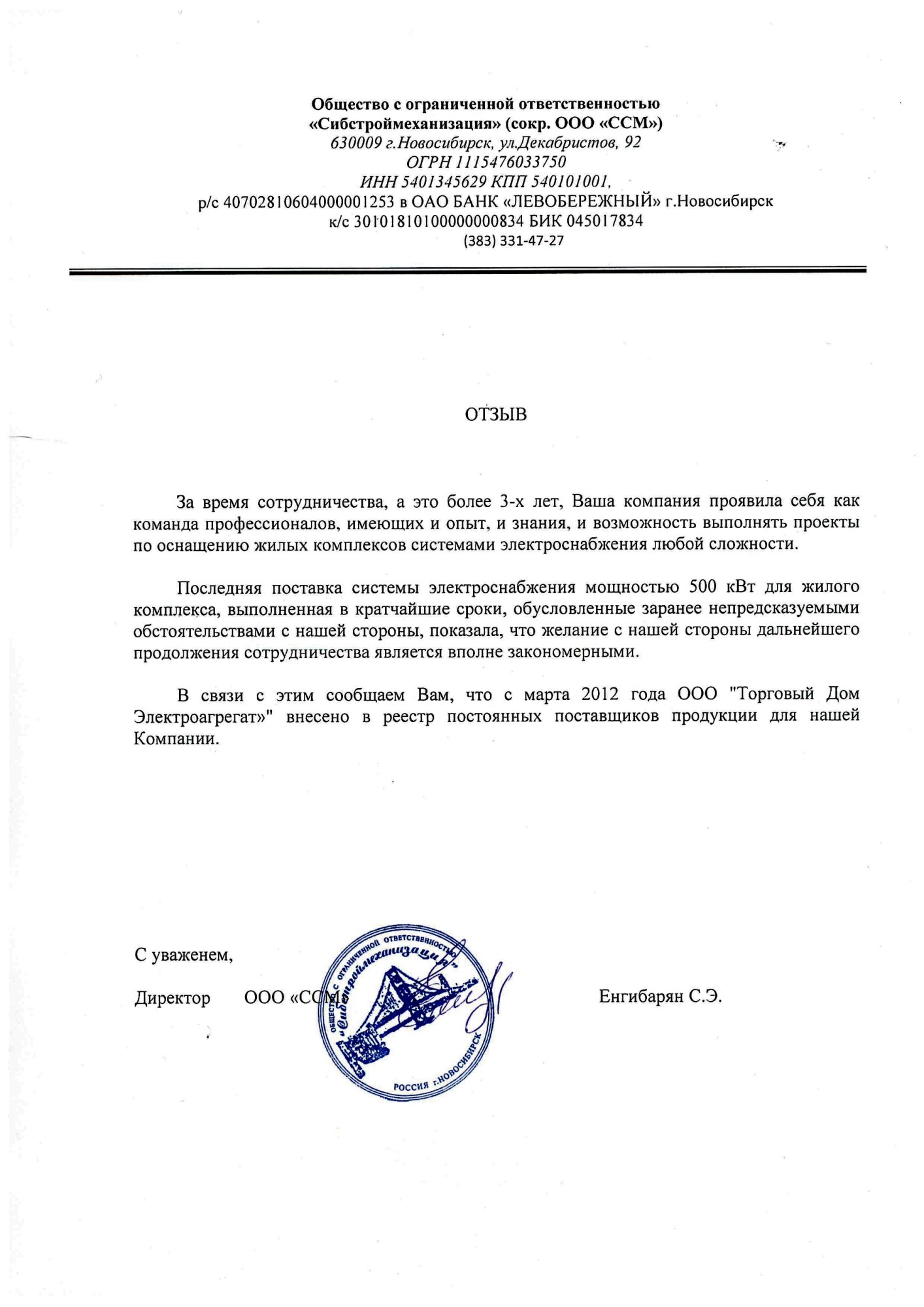 Отзыв от ООО Сибстроймеханизация за многолетнее сотрудничество и поставку ДГУ 500 квт